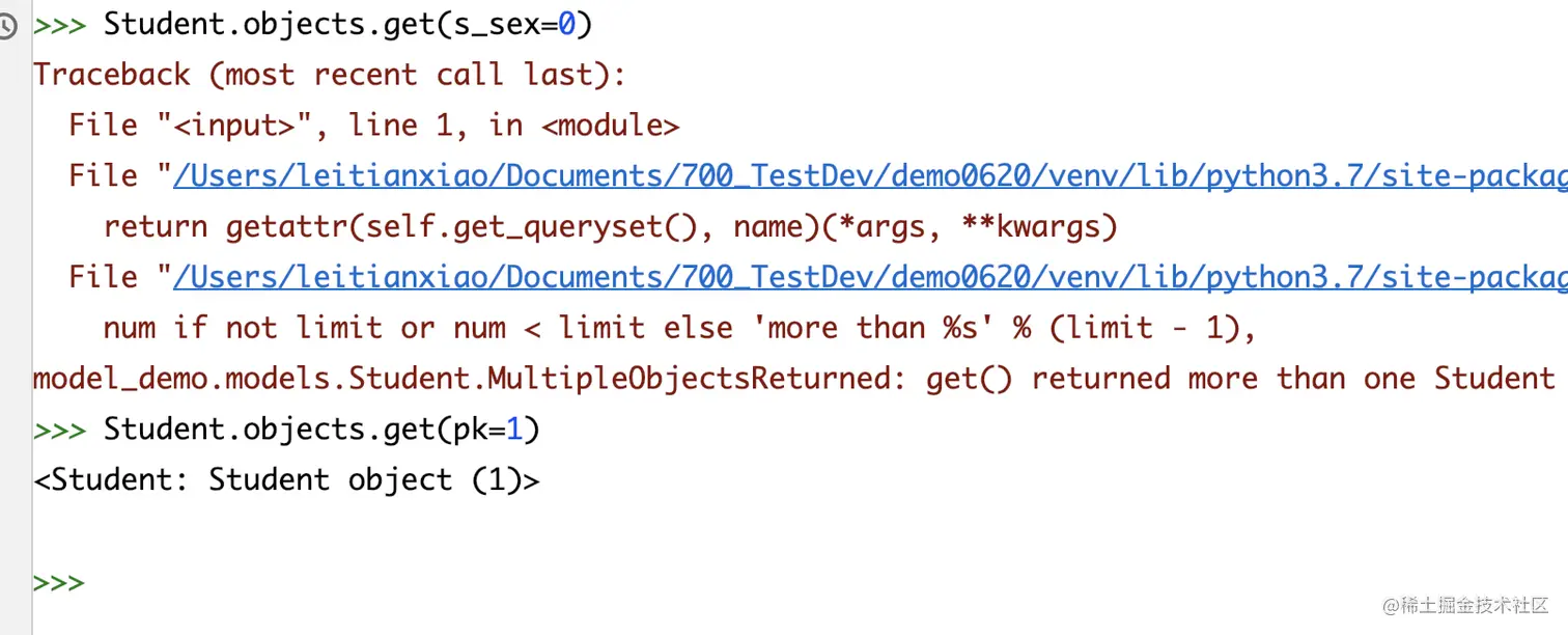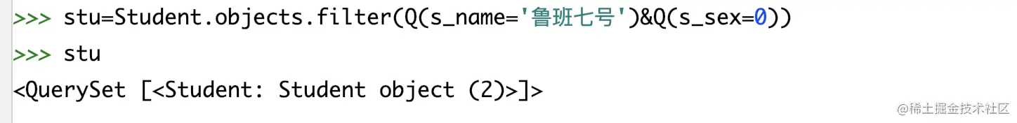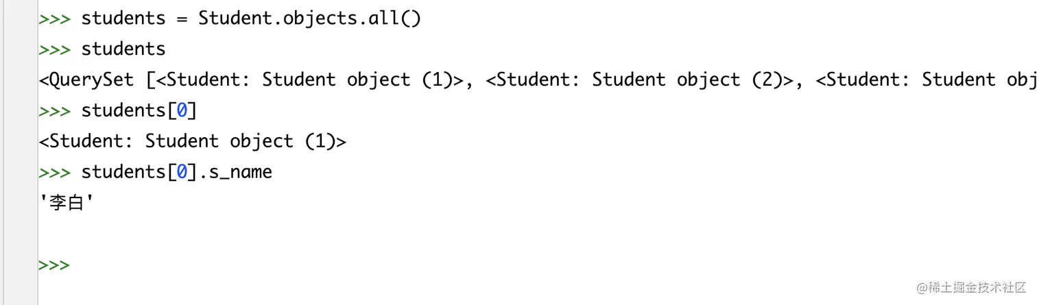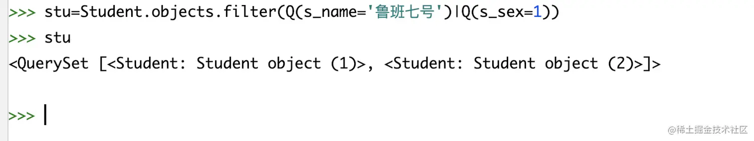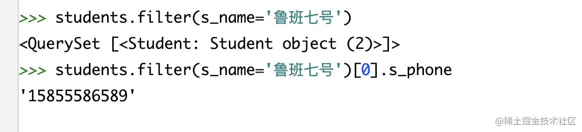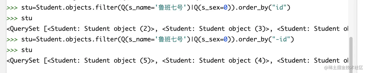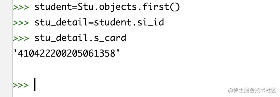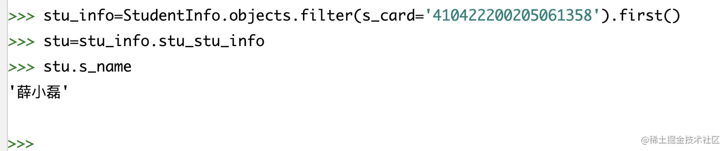 # 导入model from multi_table.models import Stu from multi_table.models import StudentInfo# 正向查询:关联student_info表查询第一条学生的身份证号 student=Stu.objects.first() stu_detail=student.si_id stu_detail.s_card# 反向查询:查询身份证号为410422200205061358的学生姓名 stu_info=StudentInfo.objects.filter(s_card='410422200205061358').first() stu=stu_info.stu_stu_info # 通过related_name进行反向查询 stu.s_name -