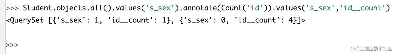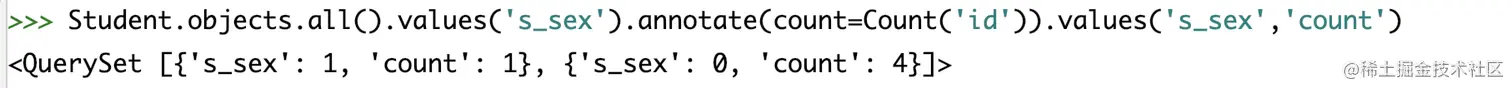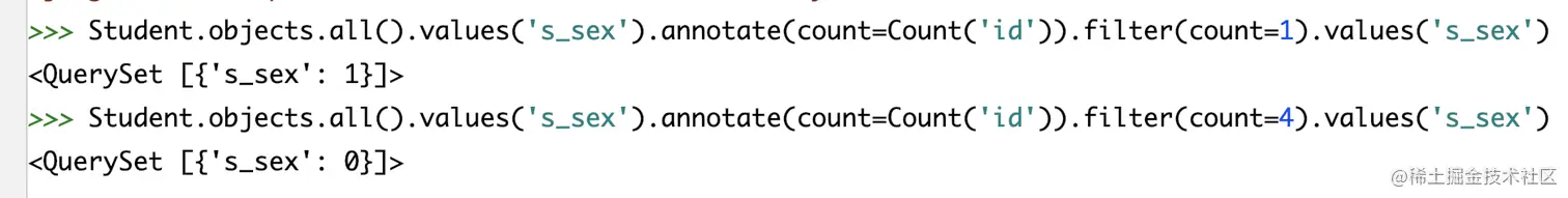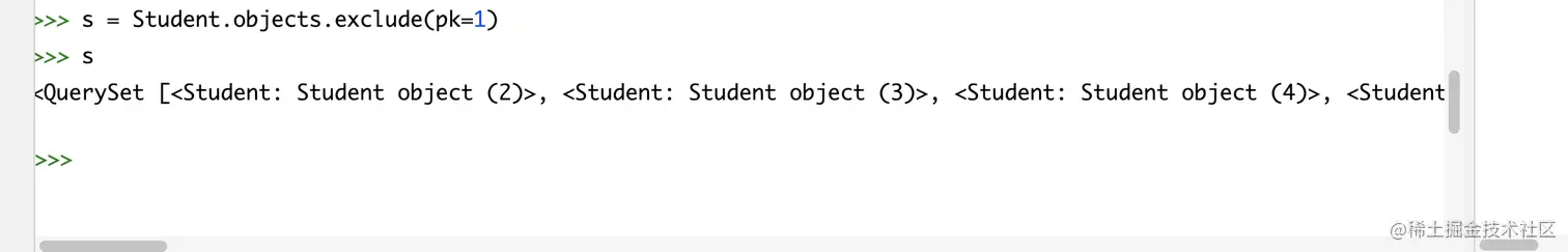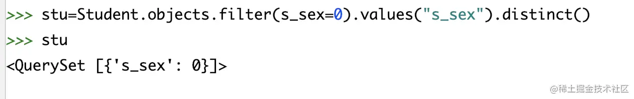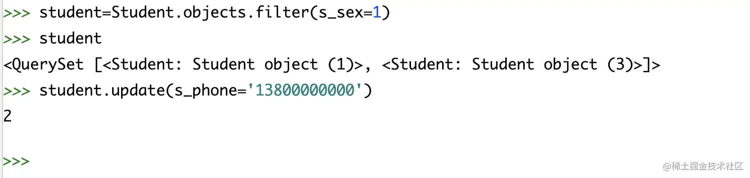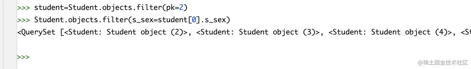 #无则加,有则删除 stu = Stu.objects.filter(s_name='薛小磊').first() # 添加编号2 3的选课记录 stu.course.add(2, 3) # 使用set方法重置选课记录为1,3 stu = Stu.objects.filter(s_name='薛小磊').first() stu.course.set([1,3]) -