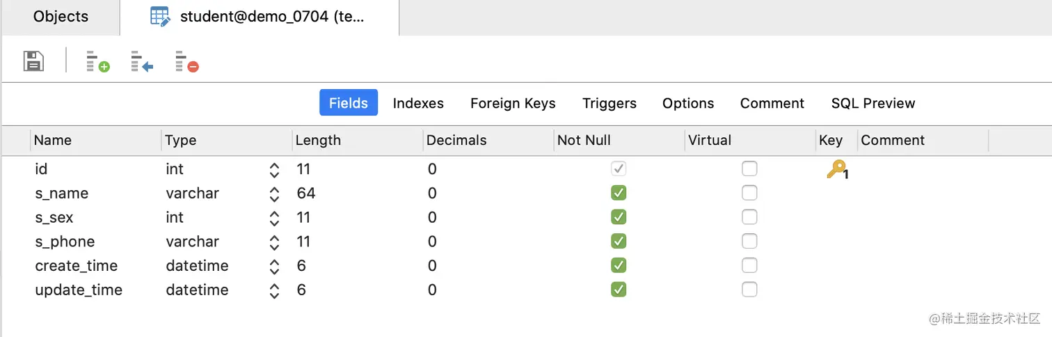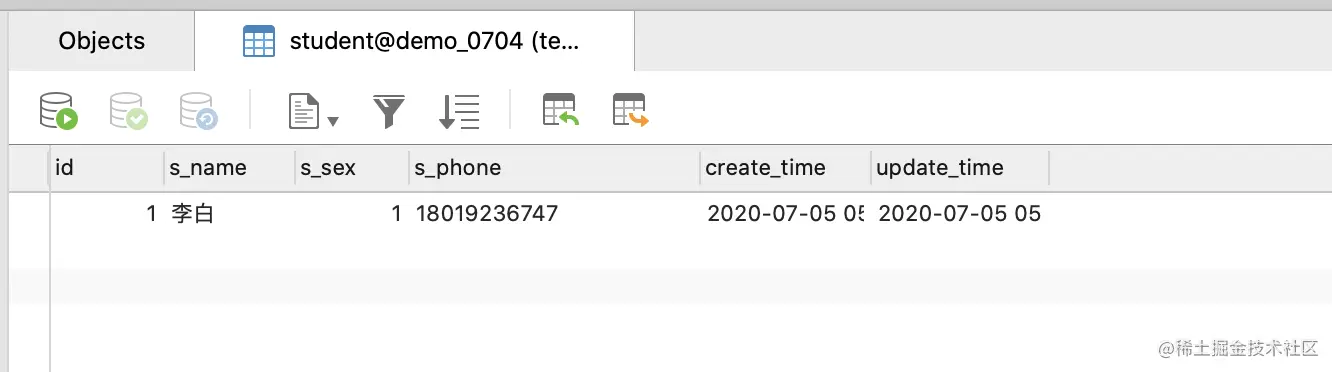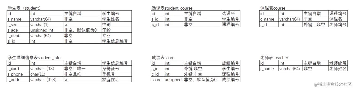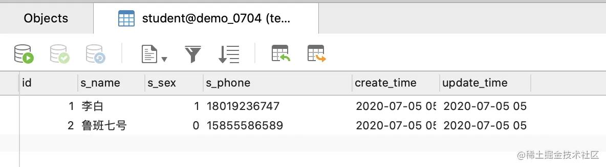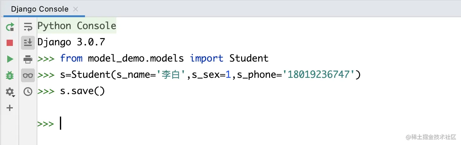 -- 数据准备sql insert into `student_info` (`id`, `s_card`, `s_phone`, `s_addr`) values('1','410422200205061358','18103909786','河南省鲁山县'); insert into `student_info` (`id`, `s_card`, `s_phone`, `s_addr`) values('2','310112199003074772','13853444534','上海闵行区'); insert into `student_info` (`id`, `s_card`, `s_phone`, `s_addr`) values('3','31011520020907641X','15520979867','上海市浦东新区'); insert into `stu` (`id`, `s_name`, `s_sex`, `s_age`, `s_dept`, `si_id`) values('2','薛小磊','0','18','计算机科学','1'); insert into `stu` (`id`, `s_name`, `s_sex`, `s_age`, `s_dept`, `si_id`) values('3','王大锤','1','30','生物科学','2'); insert into `stu` (`id`, `s_name`, `s_sex`, `s_age`, `s_dept`, `si_id`) values('4','薛大磊','0','18','外贸金融','3'); insert into `teacher` (`id`, `t_name`) values('1','张三'); insert into `teacher` (`id`, `t_name`) values('2','李四'); insert into `teacher` (`id`, `t_name`) values('3','王五'); insert into `course` (`id`, `c_name`, `t_id`) values('1','数学','1'); insert into `course` (`id`, `c_name`, `t_id`) values('2','语文','2'); insert into `course` (`id`, `c_name`, `t_id`) values('3','英语','3'); insert into `score` (`id`, `score`, `c_id`, `s_id`) values('1','80','1','2'); insert into `score` (`id`, `score`, `c_id`, `s_id`) values('2','90','2','2'); insert into `score` (`id`, `score`, `c_id`, `s_id`) values('3','85','3','2'); insert into `score` (`id`, `score`, `c_id`, `s_id`) values('4','60','1','3'); insert into `score` (`id`, `score`, `c_id`, `s_id`) values('5','55','2','3'); insert into `score` (`id`, `score`, `c_id`, `s_id`) values('6','70','3','3'); insert into `score` (`id`, `score`, `c_id`, `s_id`) values('7','30','1','4'); insert into `score` (`id`, `score`, `c_id`, `s_id`) values('8','50','2','4');tips:当模型改变时,需要刷新一下Python Console