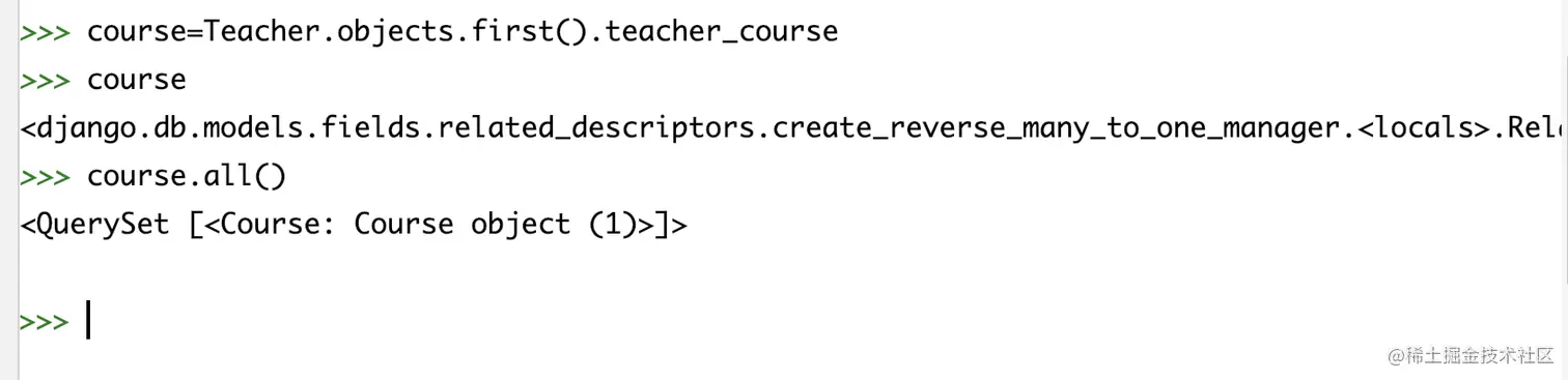 # 导入model from multi_table.models import Course from multi_table.models import Teacher# 正向查询:通过课程表查找任课老师 course=Course.objects.filter(c_name='语文').first() teacher=course.t_id teacher.t_name# 反向查询 # 通过通过related_name进行反向查询,course返回了一个model的对象 course=Teacher.objects.first().teacher_course # 对象转为查询集 courses=course.all() # 通过for循环编辑结果 for c in courses: print(c.c_name) -