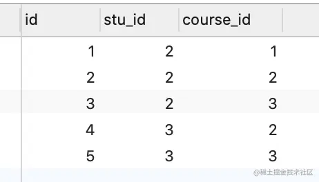 # 查询出一条数据,返回结果是Stu对象 stu = Stu.objects.filter(s_name='薛小磊').first() # 使用add方法往第三张表中添加三条和薛小磊关联的数据,`.course`是字段名 # 通过stu_id增加course_id,stu_id=2的学生,选了3门课,课程id是1,2,3 stu.course.add(1,2,3) # stu_id为3的学生,选了课程id是2,3的两门课 Stu.objects.get(pk=3).course.add(2,3) Stu.objects.get(pk=4).course.add(1,2) -