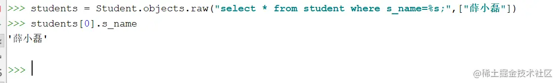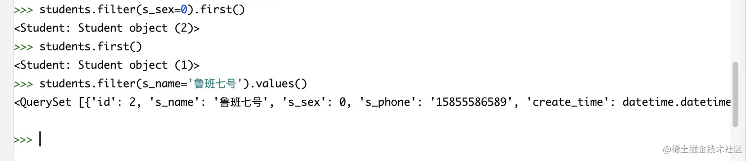 # 多对多正向查询- 根据属性course查询 # 查询 薛小磊同学选修的课程名 stu = Stu.objects.filter(s_name='薛小磊').first() courses = stu.course.all() for c in courses: print(c.c_name)# 多对多反向查询-根据related_name查询 # 查询选修了数学课程的学生姓名 course = Course.objects.filter(c_name='数学').first() students = course.course_student.all() for s in students: print(s.s_name)