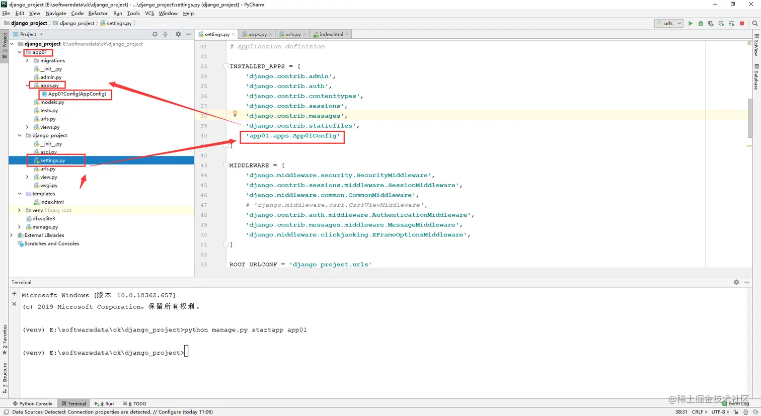 INSTALLED_APPS = [ 'django.contrib.admin', 'django.contrib.auth', 'django.contrib.contenttypes', 'django.contrib.sessions', 'django.contrib.messages', 'django.contrib.staticfiles', 'app1.apps.App1Config', # 默认已有 如果没有只要添加app名称即可 例如: 'app1' # 新建的应用都要在这里添加 ] -