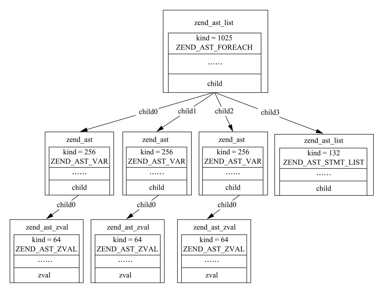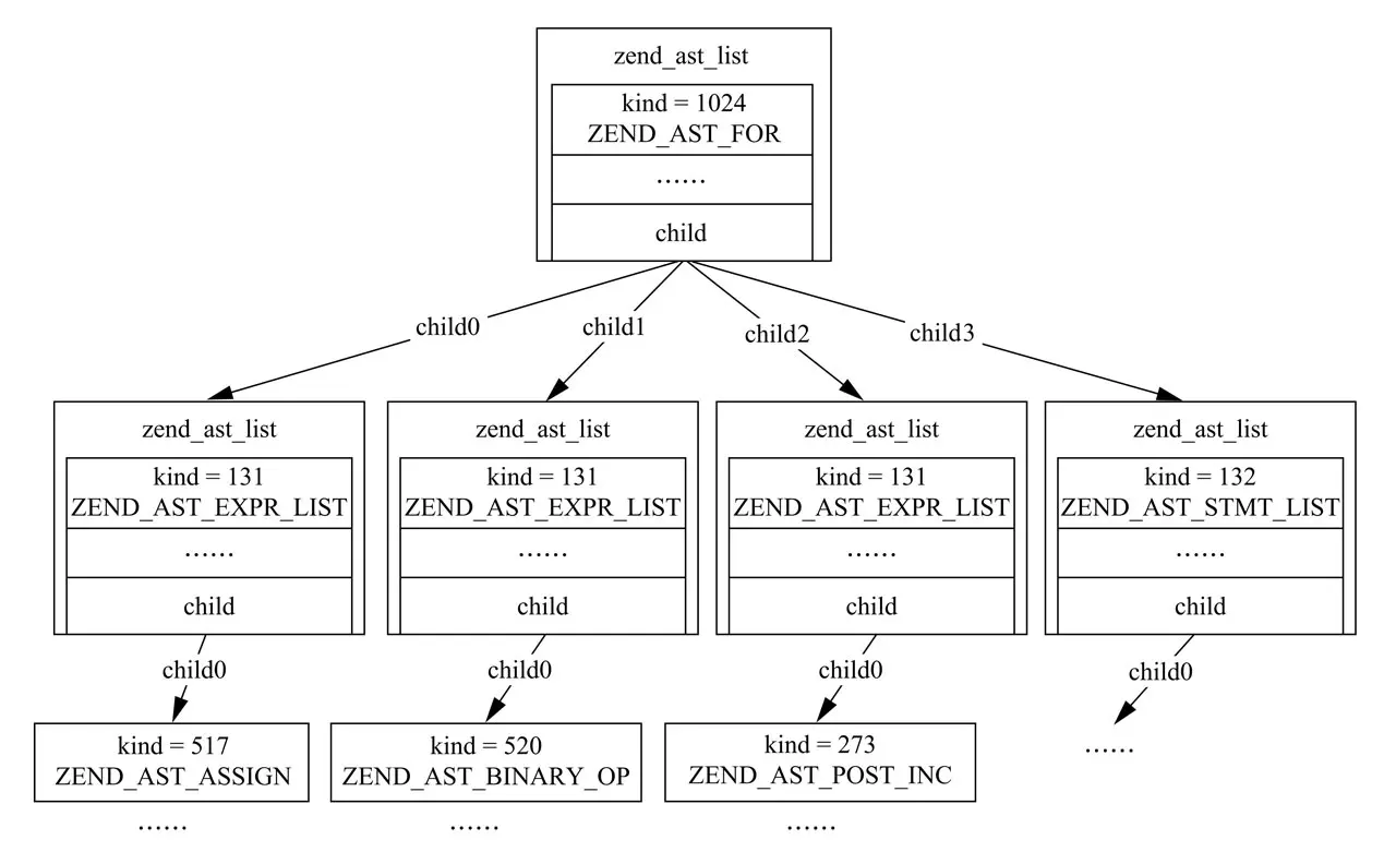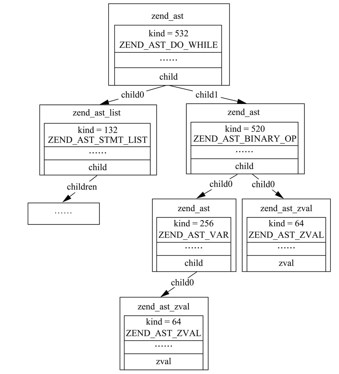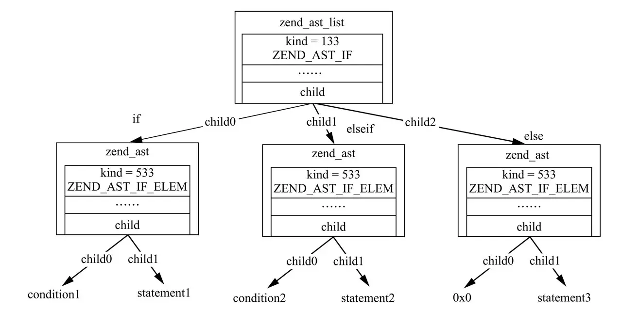 if关键字会首先创建一个kind为ZEND_AST_IF的节点。该节点作为整个条件语句代码块生成的AST的根,其子节点的kind为ZEND_AST_IF_ELEM,存储着各条件分支的信息。