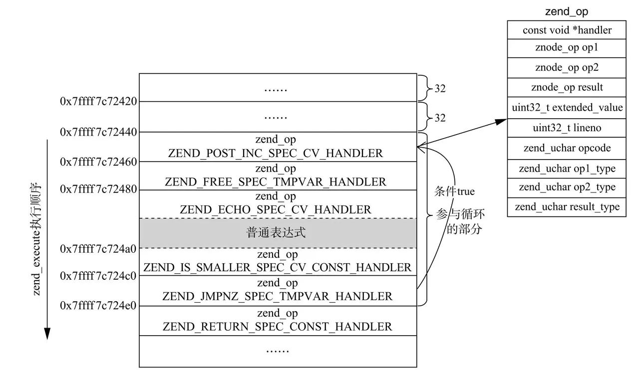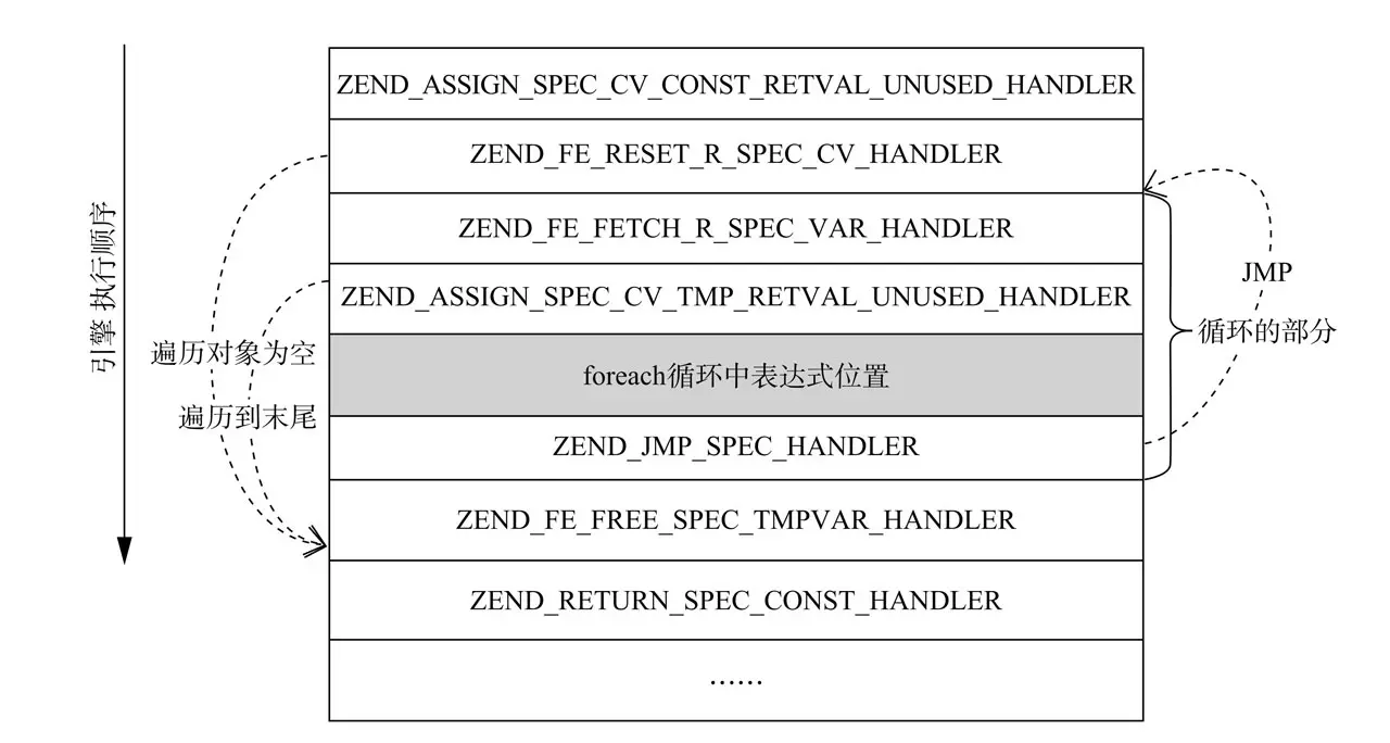 Zend引擎执行本文示例代码生成的opcode、调用handler的流程如图12-2所示。