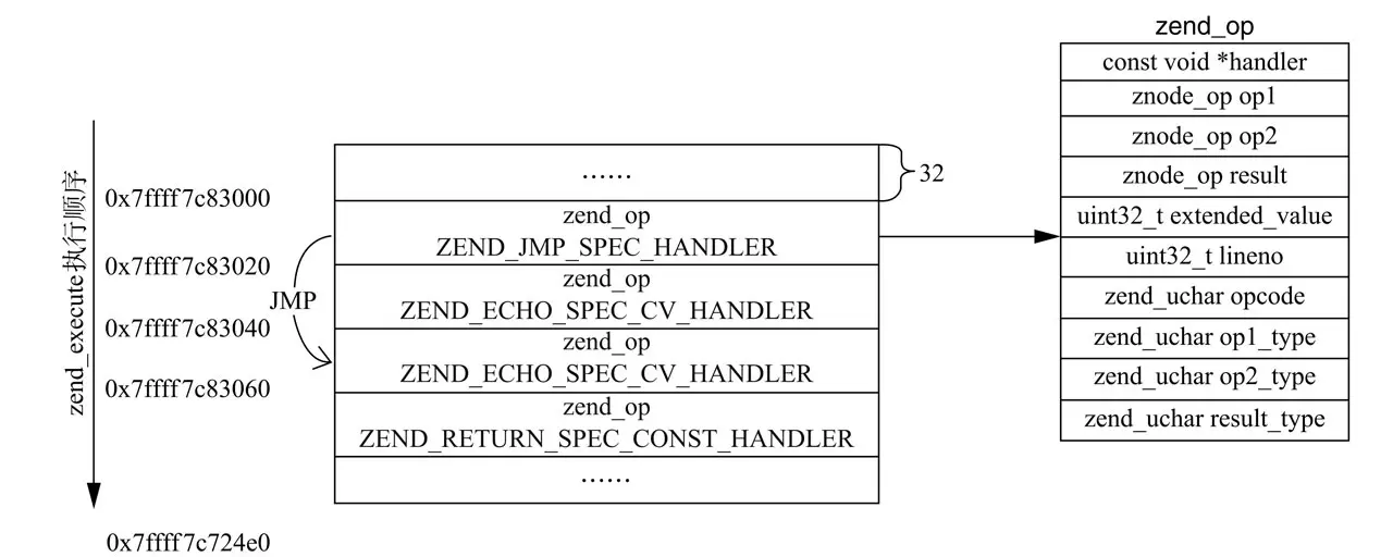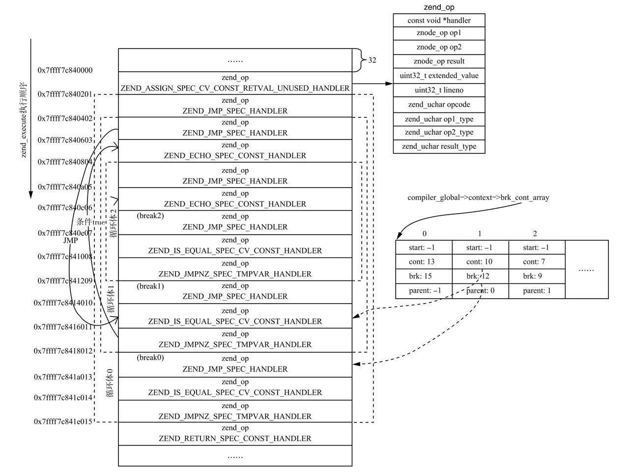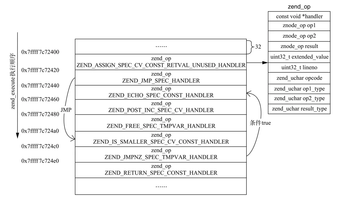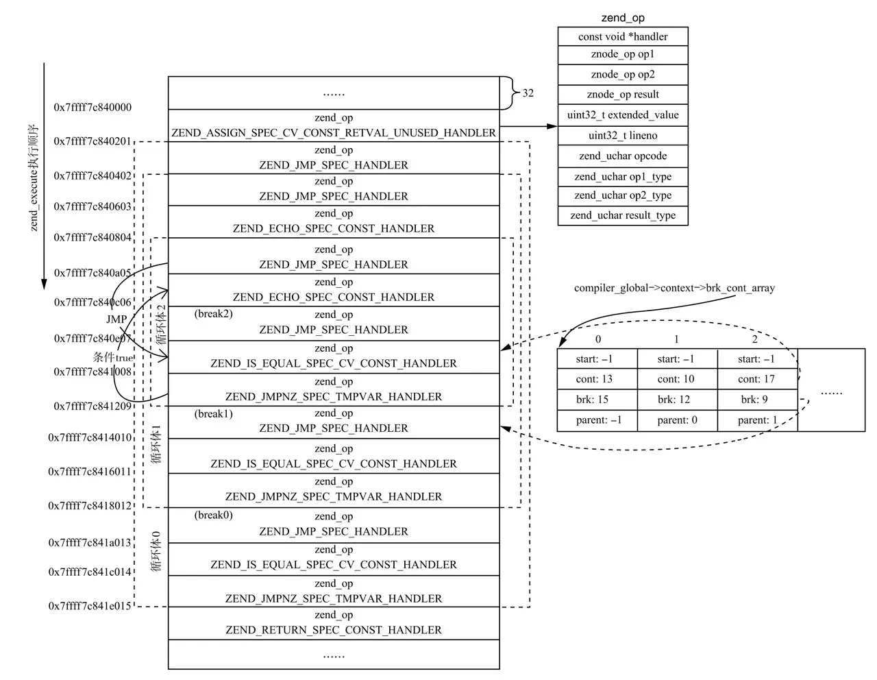 以前文的PHP代码为例,条件判断子过程为判等语句,而语句执行子过程为“echo”语句,对应的opcode分别是T_IS_EQUAL和T_ECHO,执行过程比较简单。这里将焦点集中到跳转子过程。