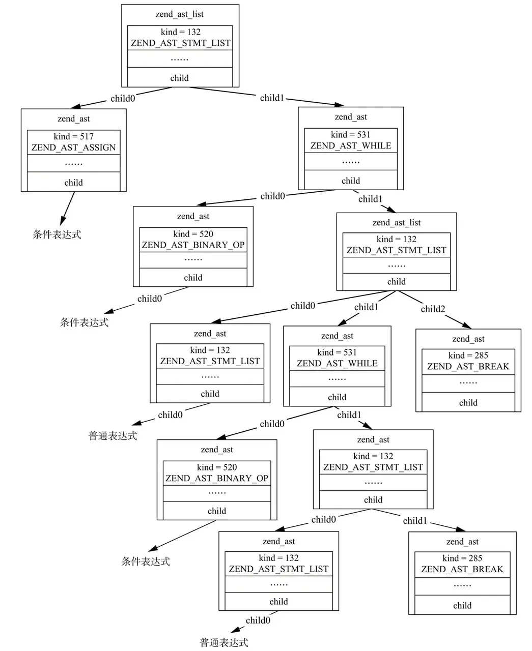 从图12-1可以看出,AST的根是kind为ZEND_AST_IF的节点。根的3个孩子节点分别存储着if、elseif和else条件分支的信息。每个条件分支节点的孩子,又分别记录着该分支的condition和statement。因为else语句没有条件表达式(condition),所以child0节点位置为空。