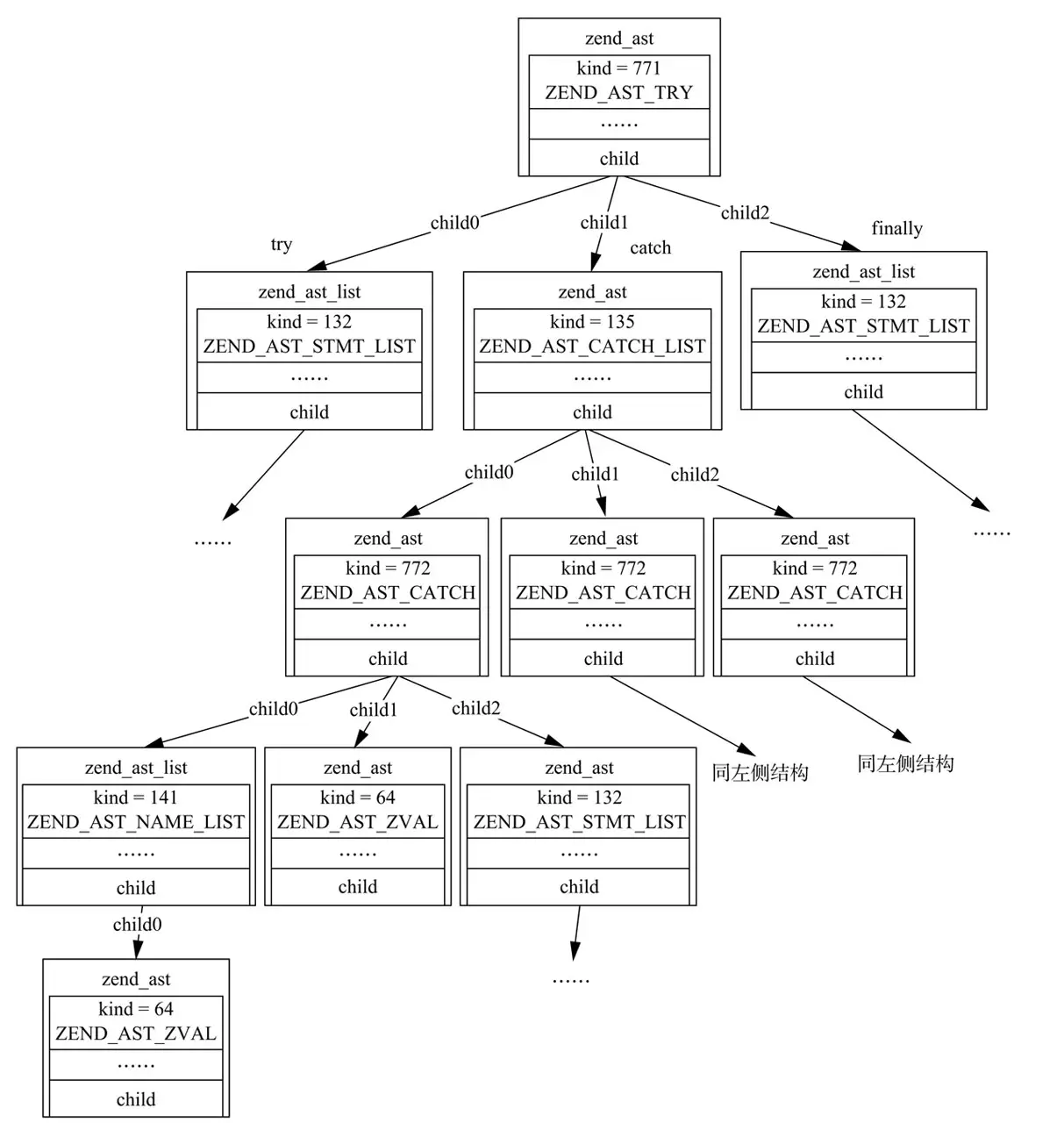 如以上代码所示,try结构由普通表达statement构成,catch和finally也有表达式列表。try、catch、finally关键字会生成T_TRY、T_CATCH和T_FINALLY的Token。
