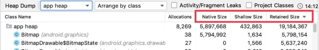 当您拿到一段 Heap Dump 之后,Memory Profiler 会展示出类的列表。对于每个类,"Allocation" 这一列显示的是它的实例数量。而在它右边则依次是 "Native Size"、"Shallow Size" 和 "Retained Size":