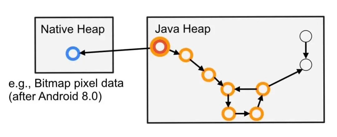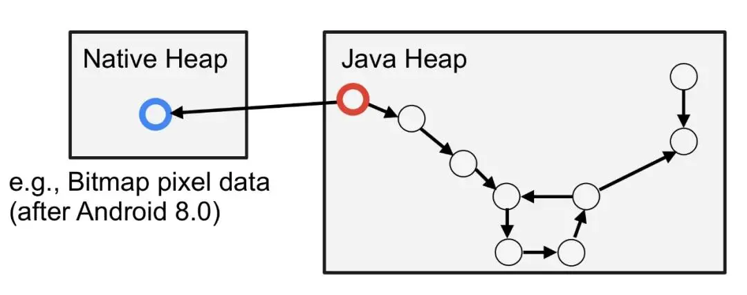 我们用下图来表示某段 Heap Dump 记录的应用内存状态。注意红色的节点,在这个示例中,这个节点所代表的对象从我们的工程中引用了 Native 对象:
