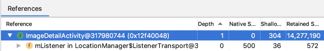 值得警惕的是,如果您看到某个实例的 "Depth" 为 1 的话,这意味着它直接被 GC root 引用,同时也意味着它永远不会被自动回收。