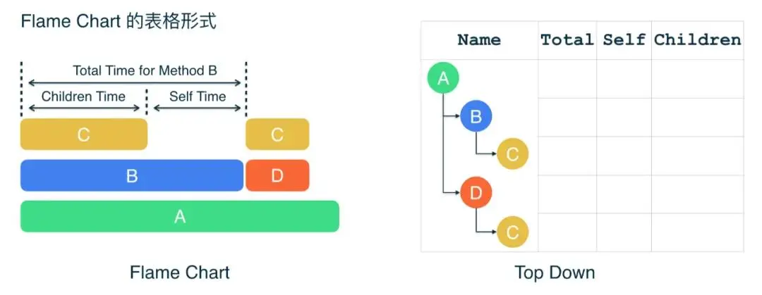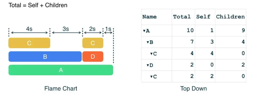 构建一个 Top Down Tree 并不复杂。以 Flame Chart 为基础,您只需要从调用者开始,持续添加被调用者作为子节点,直到整个 Flame Chart 被遍历一遍,您就获得了一个 Top Down Tree: