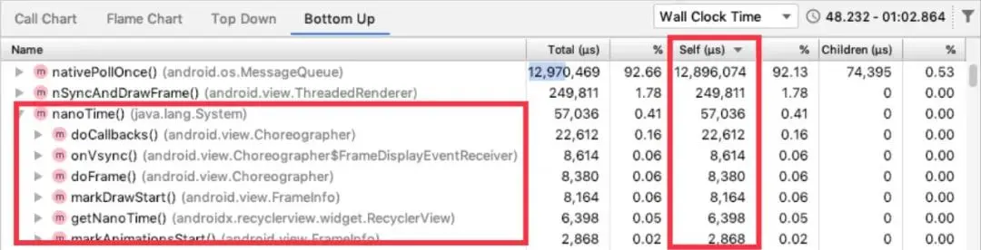 下面是表格完全展开的状态。当您在 Android Studio 中分析应用时,CPU Profiler 会完成上面所有的计算,您只要理解这些数字是怎么产生的即可: