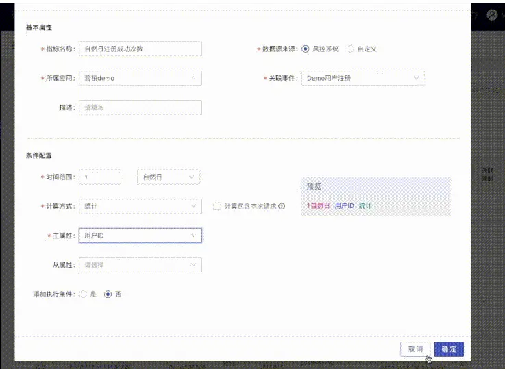 第一步,进入指标配置。“单日注册成功波动比”策略里需要使用“自然日注册成功次数”的指标,新建名为“自然日注册成功次数”的指标。