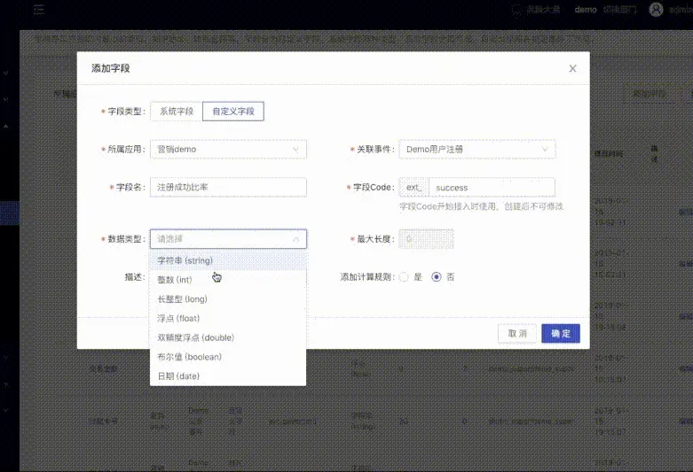 第二步,进入字段配置。新建一个字段,来计算注册成功比。