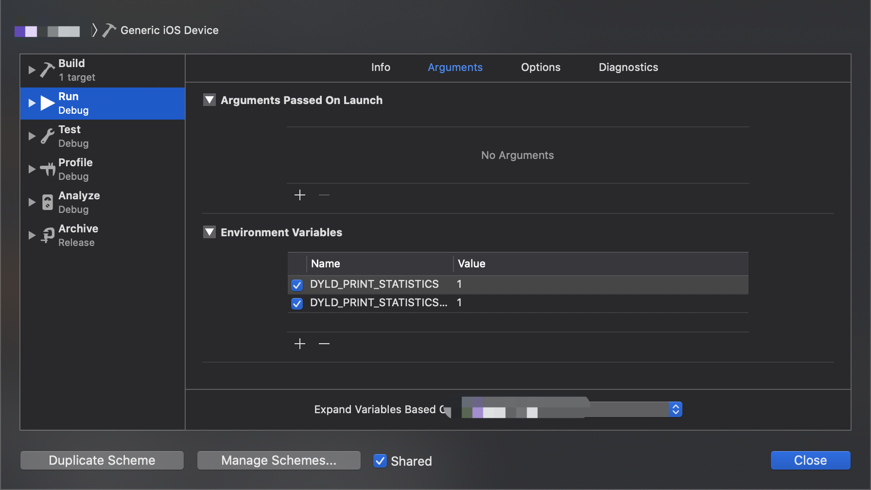 - 添加环境变量参数:在Xcode -> Product -> Scheme -> Edit Scheme -> run -> Arguments。配置参数:DYLD_PRINT_STATISTICS