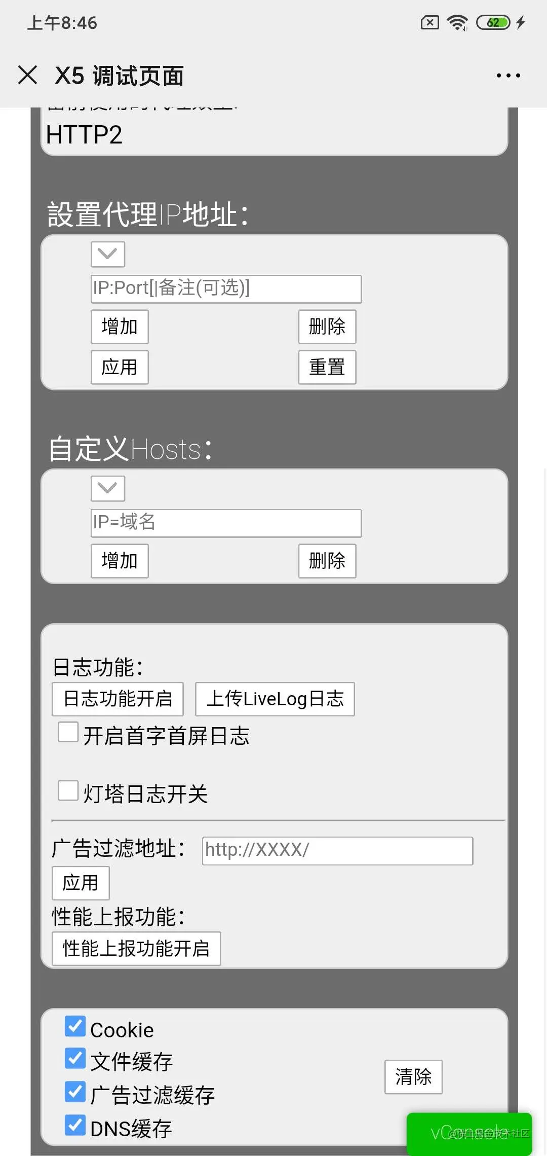 勾选vConsole调试功能即可在手机网页上查看控制台输出