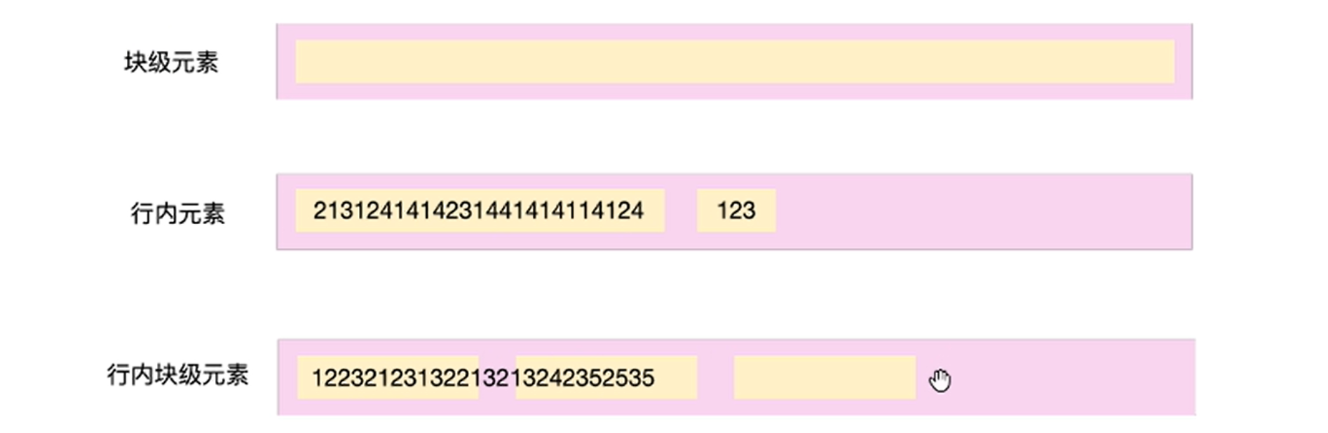 行内元素无法控制自己的宽高,而是由自己的内容填充而来。但其可以与其他行内元素处于同一个块级元素之内;