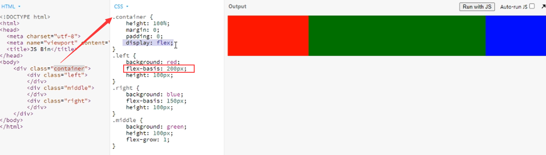 flex-basis定义【分配多余空间前,该 item 在主轴上占据的宽度】,浏览器会根据 flex-basis 来确认主轴上是否还有多余的空间,如果有,则按照flex-grow: 1来让中间的元素自动填满剩余空间