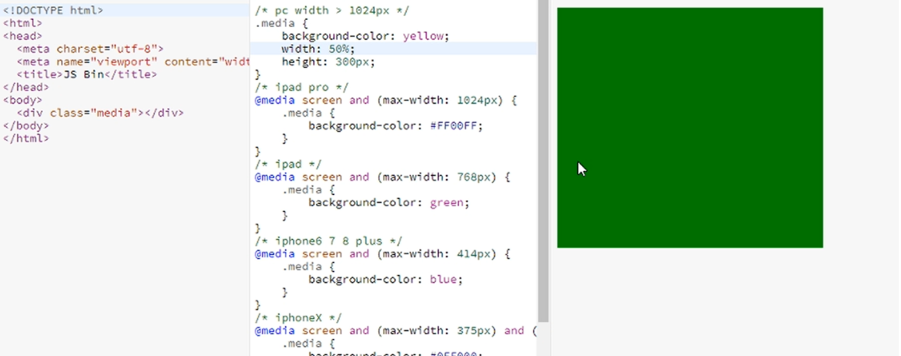 - 针对不同的屏幕尺寸,设置对应的样式。使用 50% 规定宽度,可控制总占页面宽度 50%