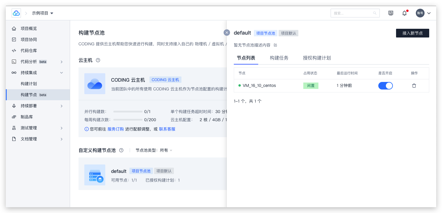 在 CODING 构建节点页也可以看到新注册上线的服务器。