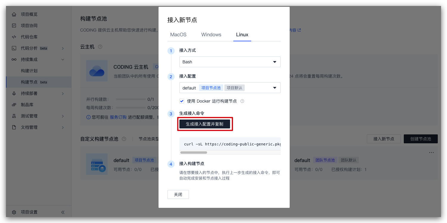 待 Docker 安装完成后,前往 CODING 进入【项目】>【持续集成】>【构建节点】,在构建节点页复制配置命令。