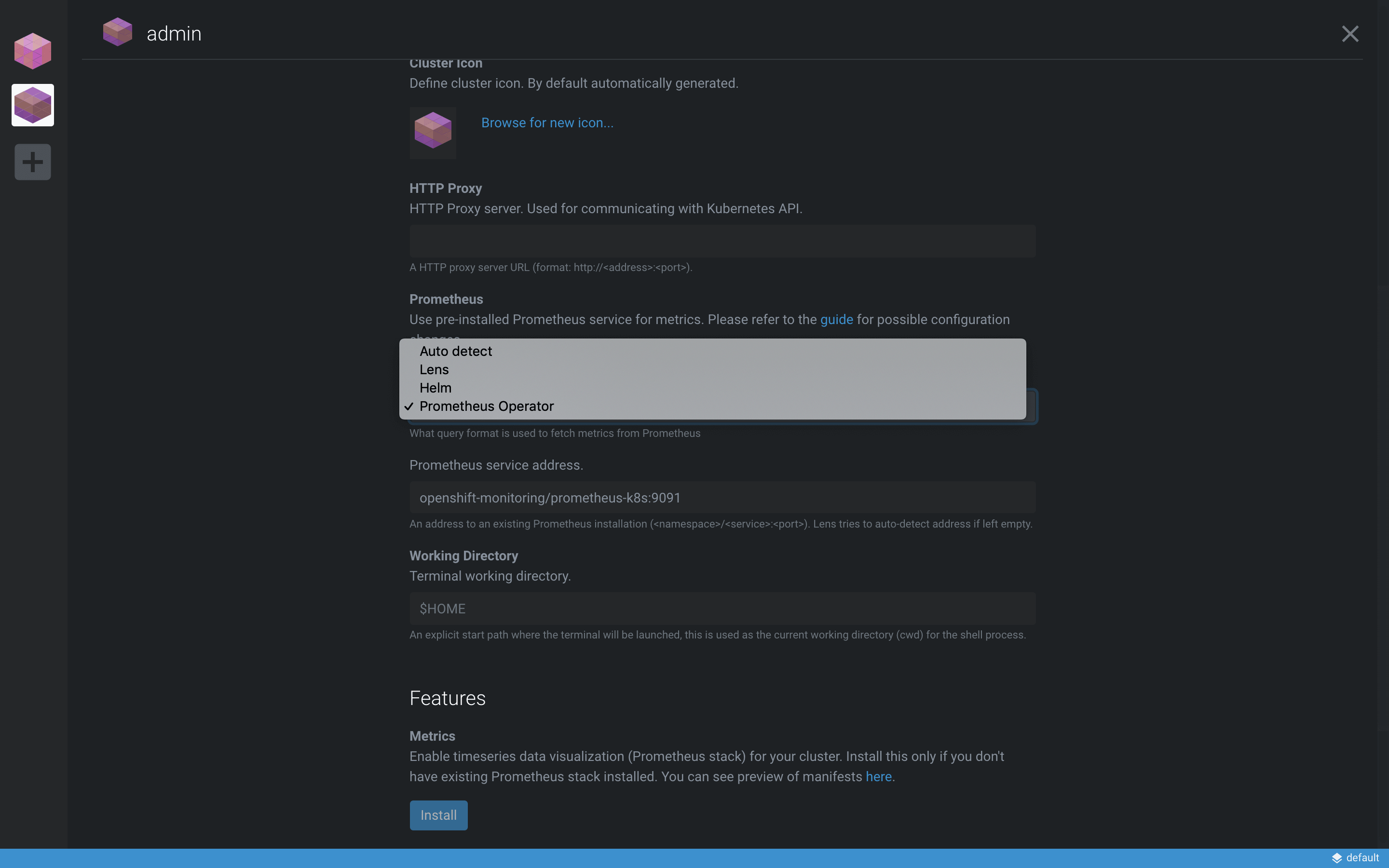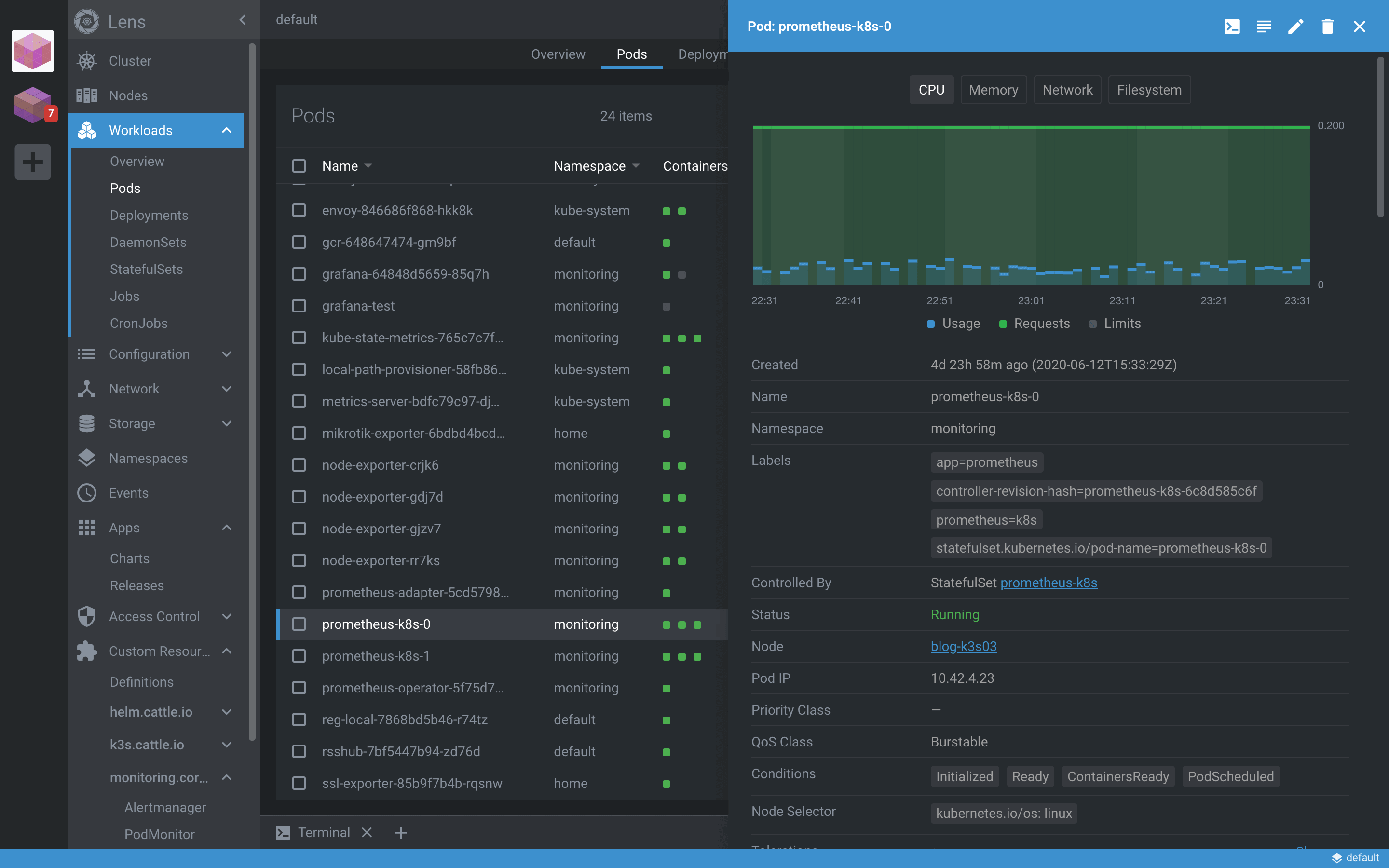 ③ Lens 内置了资源利用率的仪表板,支持多种对接 Prometheus 的方式: