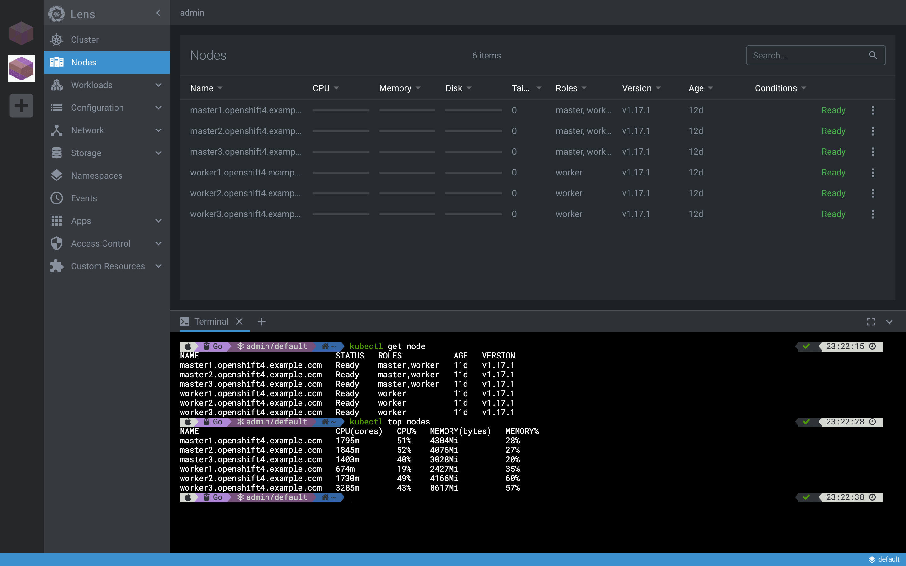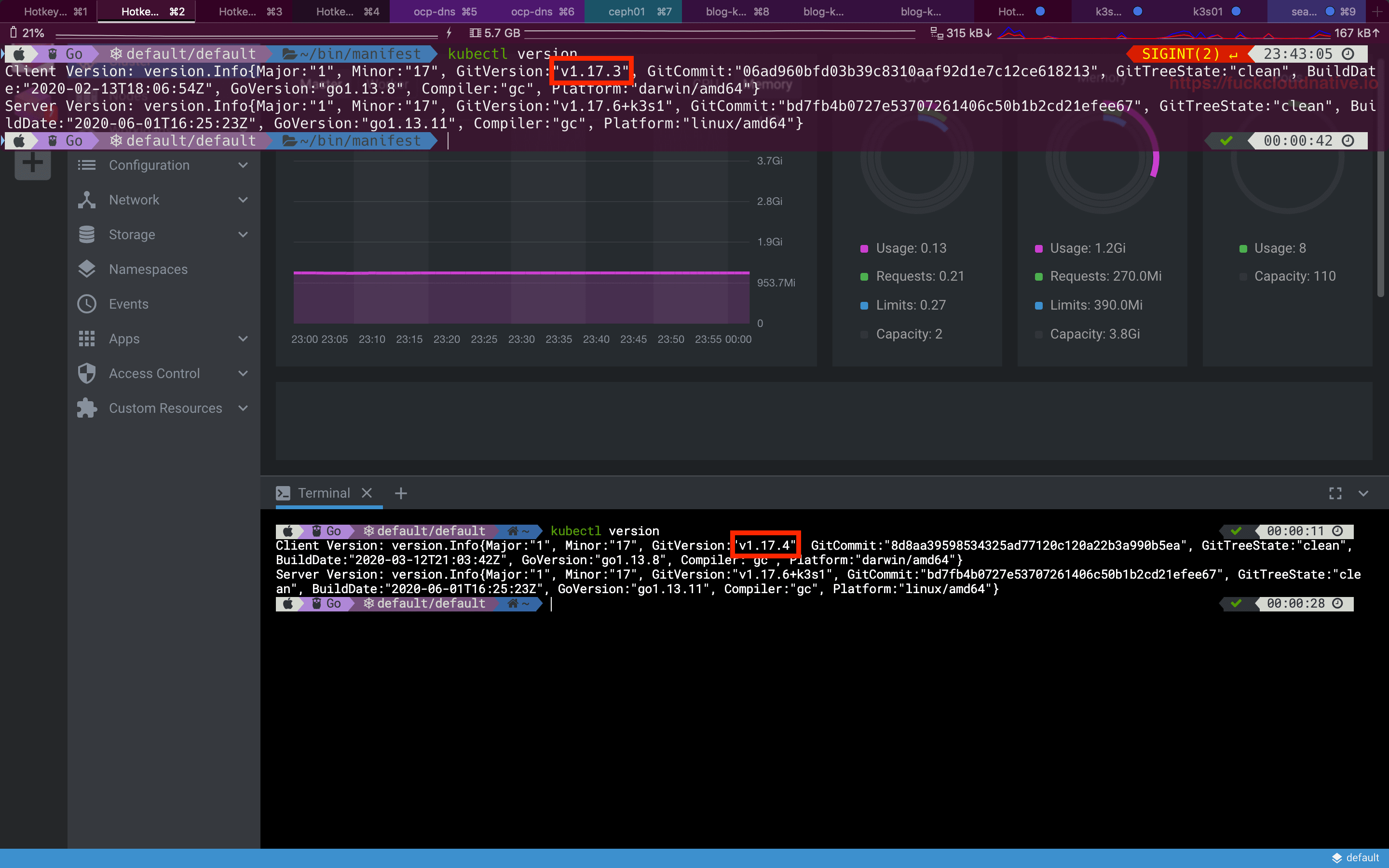 你会看到本地安装的 kubectl 版本和 Lens 里面打开的终端里的 kubectl 版本信息是不一样的,Lens 确实内置了 kubectl。