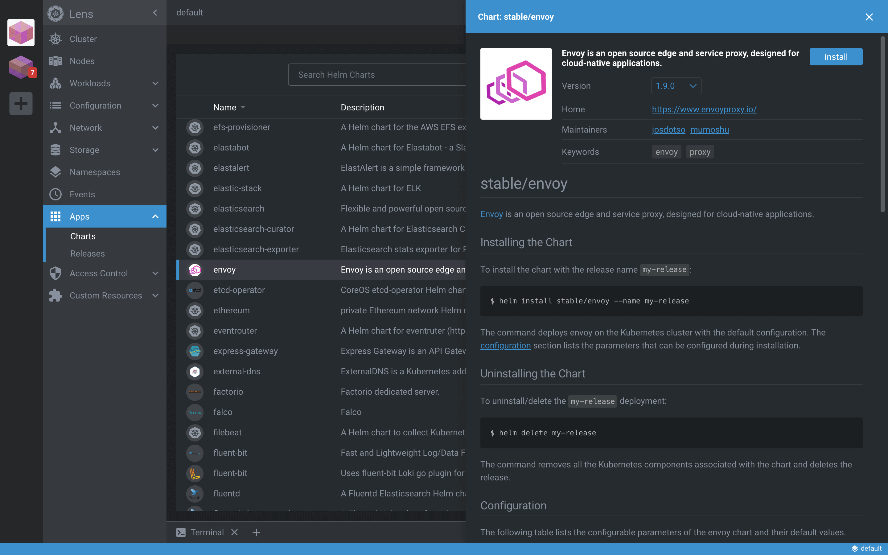 ⑤ Lens 内置了 helm 模板商店,可直接点击安装: