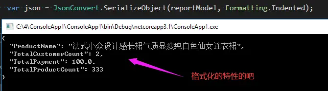 - 代码格式化 如果你直接使用 JsonConvert.SerializeObject的话,默认情况下所有的json是挤压在一块的,特别不方便阅读,如下所示: