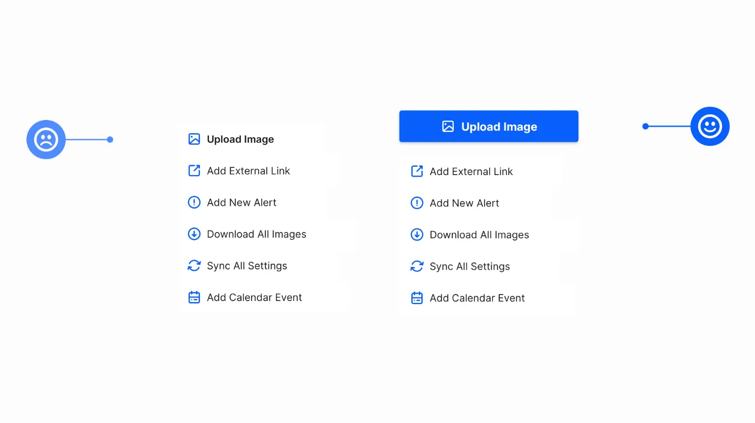 设计在应用程序内部使用的菜单时,(页面中的功能操作)请确保在屏幕上突出显示最常用的操作(即,上载图像,添加文件等)。