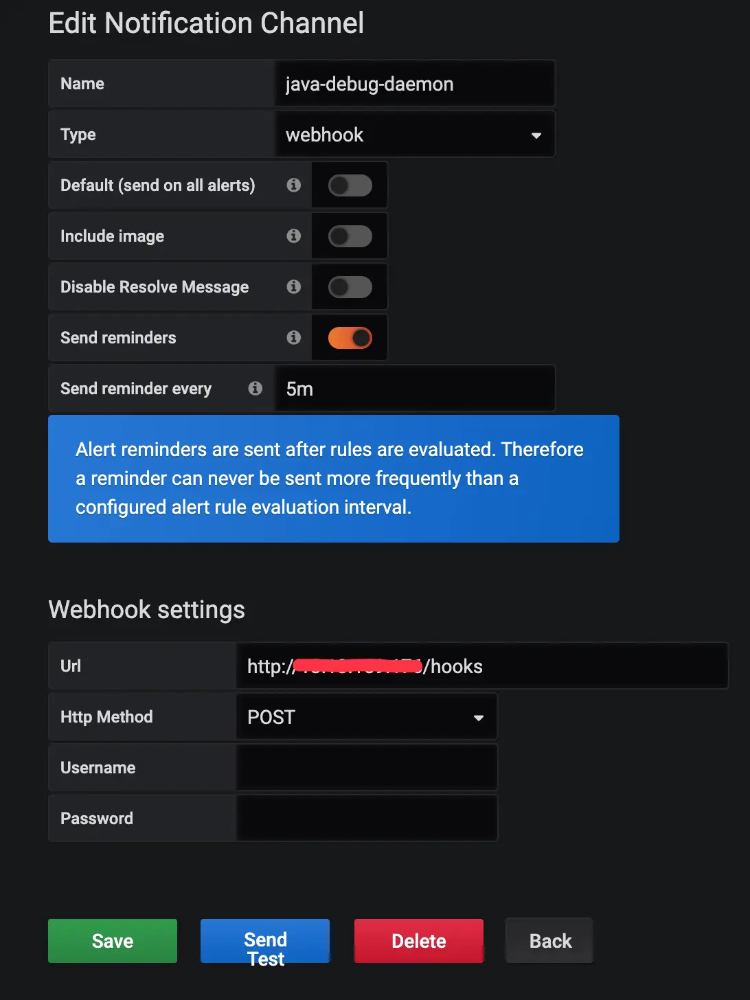 - 需要打开 Send reminders, 不然 Grafana 默认在触发告警后一直没有解决不会重复发送告警