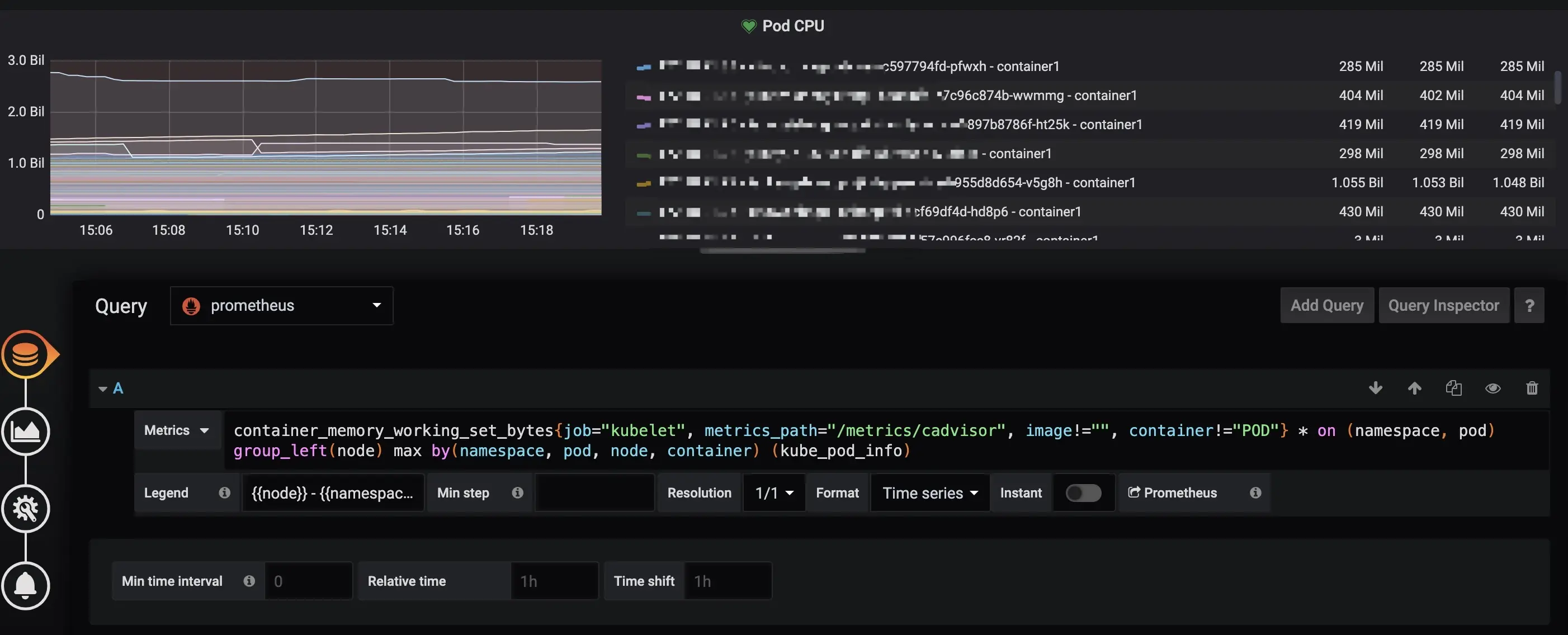 "expr": "container_memory_working_set_bytes{job=\"kubelet\", metrics_path=\"/metrics/cadvisor\", image!=\"\", container!=\"POD\"}* on (namespace, pod) group_left(node) max by(namespace, pod, node, container) (kube_pod_info)",