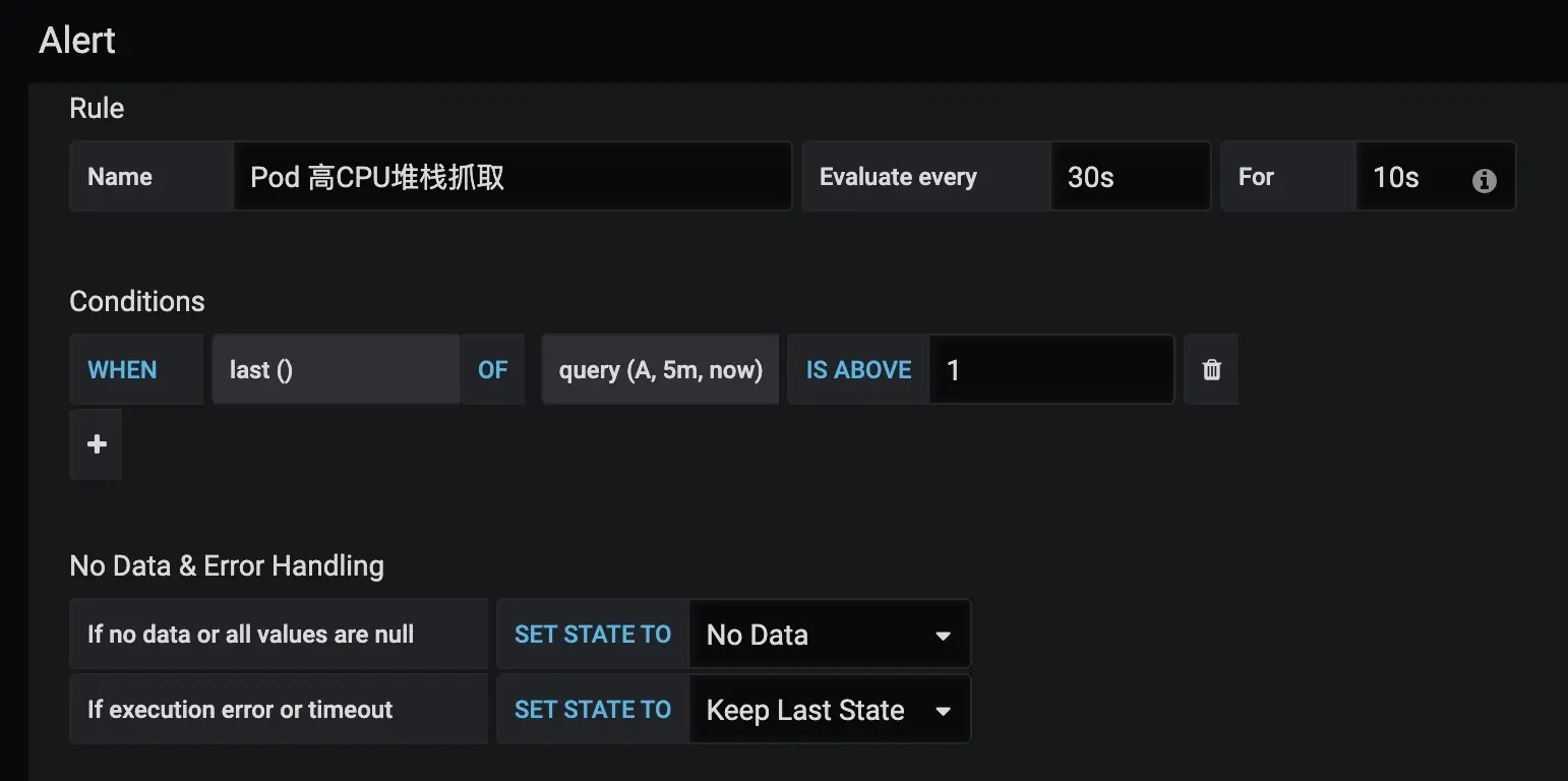 利用了 Grafana 的告警机制,配合阿里的 arthas,来完成高CPU使用率线程的堆栈抓取。