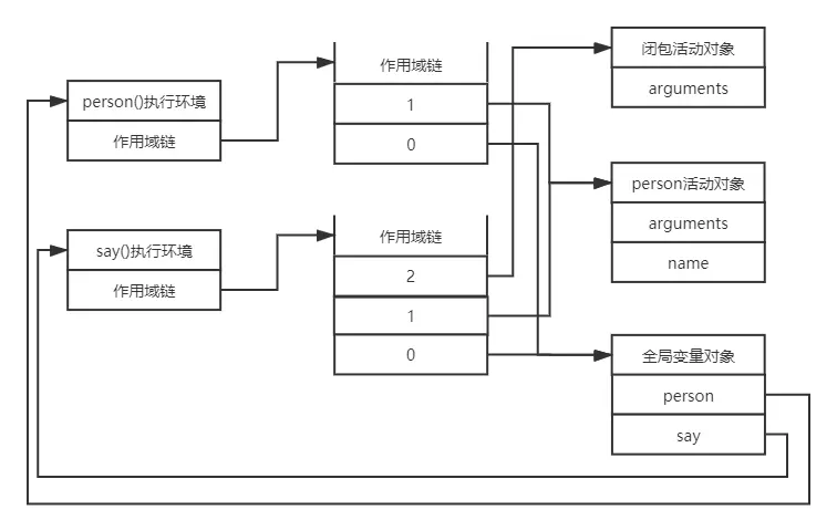 function person(name){ return function say(){ console.log(name); } } person('Tom')();//Tom闭包能访问外部函数变量的原因: