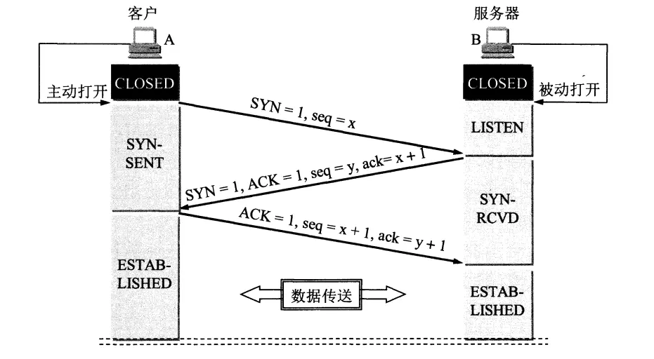 ACK=1 seq=x+1 ack=y+1 - 此时,TCP的连接已经建立,A进入
