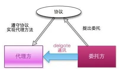代理,又称委托代理(delegate),是iOS中常用的设计一种模式。顾名思义,它是把某个对象要做的事情委托给别的对象去做。那么别的对象就是这个对象的代理,代替它来打理要做的事。反映到程序中, 首先要明确一个对象的委托方是哪个对象,委托所做的内容是什么。在iOS程序设计中,委托通过一种@protocol的方式实现,所以又称为协议。在iOS的SDK里面,UITableView、UITextField等都有用到这种设计模式。 协议,是多个类共享的一个方法列表,在协议中所列出的方法没有响应的实现,由其它类来实现。委托是指给一个对象提供机会对另一对象中的变化做出反应或者相应另一个对象的行为。其基本思想是协同解决问题。
