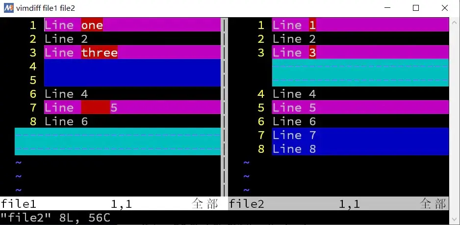 该命令后面通常会接两个或多个文件名作为参数,这些文件会同时在 Vim 编辑器的分割窗口中打开,并高亮显示文件中内容有差异的部分。