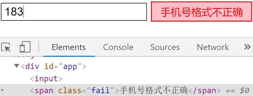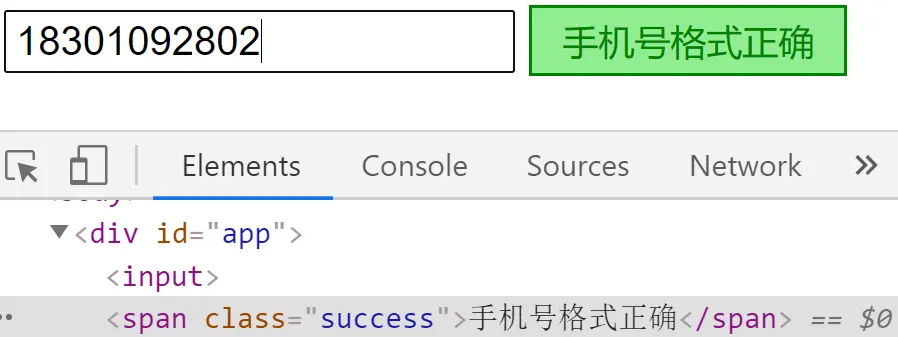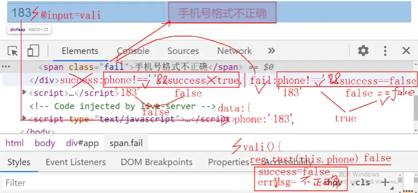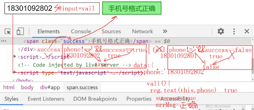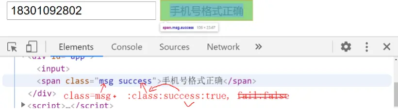 临时创建一个匿名对象的意思 绑定 ↓ 1). <元素 :class="{ class名1: bool表达式或变量, class名2: bool表达式或变量 }" 2). 原理:newVue()首次扫描到这里时,或依赖的变量发生变化时 i. 计算每个class名之后的bool表达式或变量值 ii. 如果一个class名之后的bool表达式或变量值为true,则该class会出现在最终的元素上发挥作用——亮灯 iii. 如果一个class名之后的bool表达式或变量值为false,则该class不会出现在最终的元素上,不会发挥作用!——灭灯 3). 示例: 验证手机号格式是否正确——带css样式