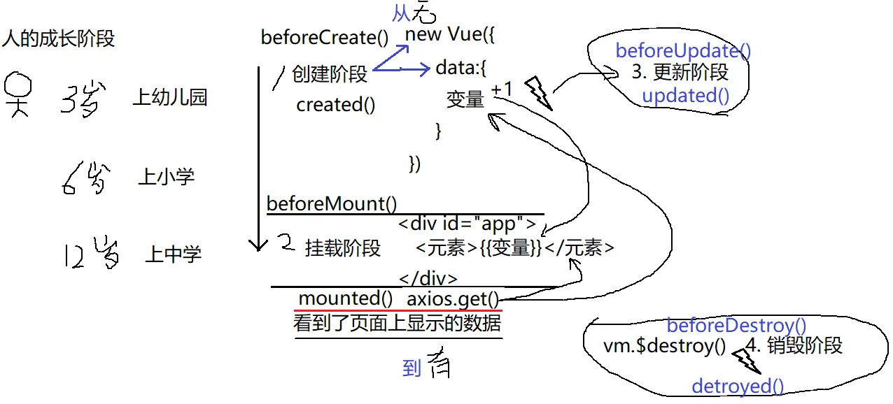 (4). 销毁 destroy 还有调用$destroy函数销毁当前组件时,才触发 —— 很少用 3. 为什么要学习生命周期: