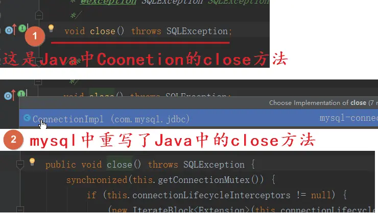 Java中有一个接口就是Connection接口,其中就有close方法。这个接口就是Java制定的一个数据库规范。