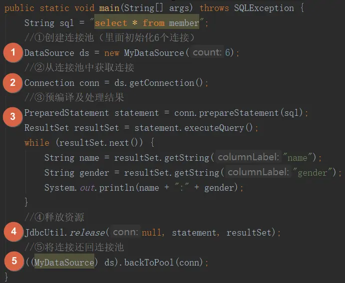 我们要将close方法改造成将连接还回连接池,肯定要传进来一个我们正在使用的连接池。