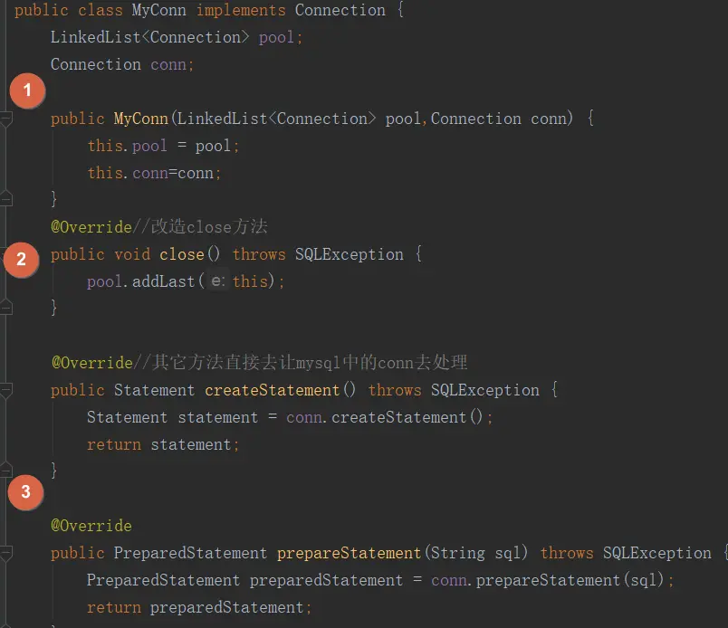 最后我们要将MySQL连接中的close方法做一个改造,同时其它的方法都不用改变。