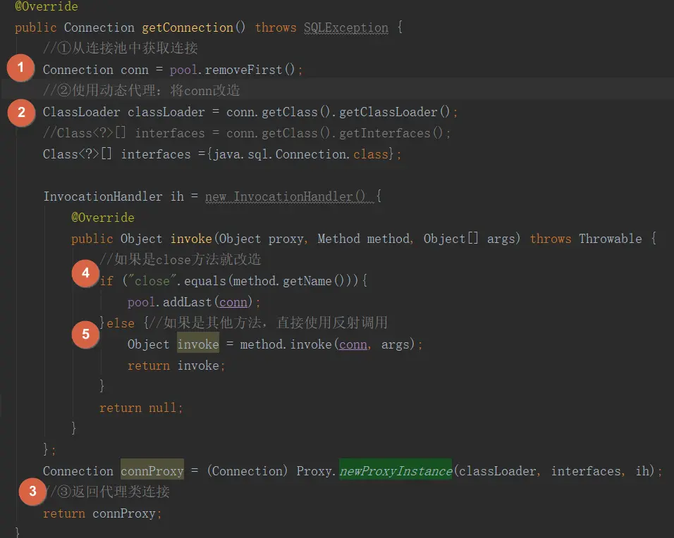 后续conn调用close方法,就将其改造成我们想要的业务逻辑,也就是将连接添加到连接池中。