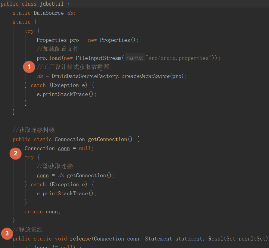 今天学了连接池,那么也可以把连接池封装进工具类JdbcUtil中,比如说我们使用德鲁伊连接池: