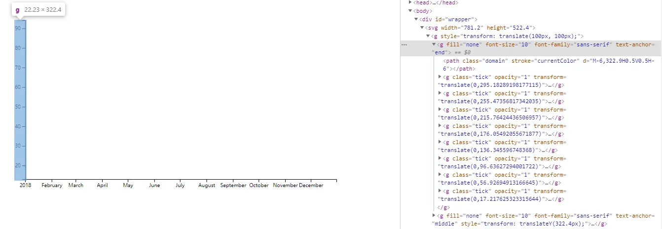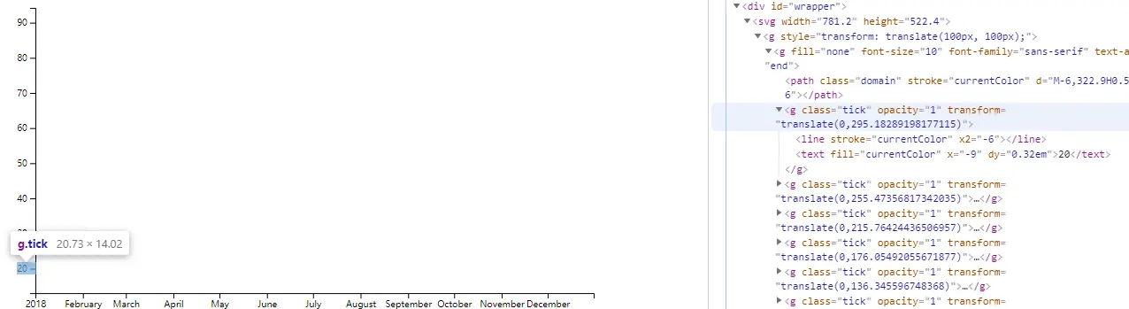 g元素包裹//const yAxis = bounds.append("g"); //yAxisGenerator(yAxis); //在g元素内画y轴 const yAxis = bounds.append("g").call(yAxisGenerator); //调用call(),写成链式; xxx.call(xx)以xxx作为第一个参数执行xx函数 const xAxis = bounds.append("g").call(xAxisGenerator) .style("transform",`translateY(${dimensions.boundedHeight}px)`); //生成x轴时,默认在最上方,需要挪到所需底部位置