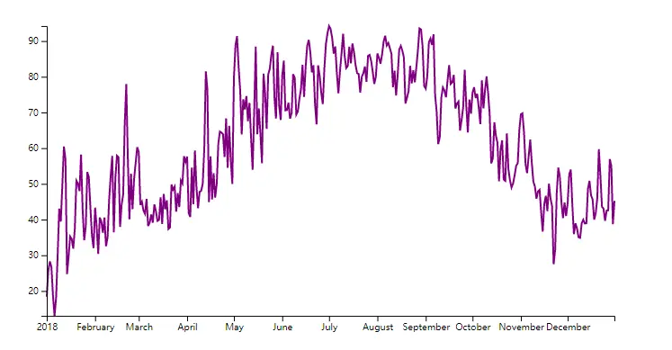 const yScale = d3.scaleLinear() .domain(d3.extent(dataset, yAccessor)).range([dimensions.boundedHeight,0]) //yAccessor取dataset中所需的所有温度值 d3.extent()返回数组中的最小值和最大值 由于svg-y坐标轴正方向向下,所以映射出range是从大到小的范围 const xScale = d3.scaleTime().domain(dataset,xAccessor).range([0,dimensions.boundedWidth]) -