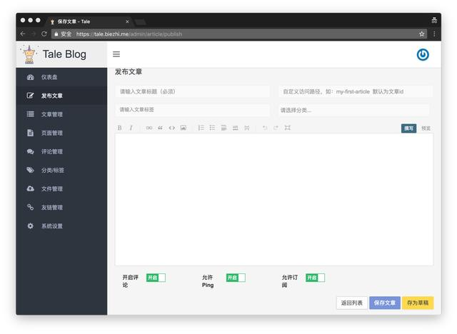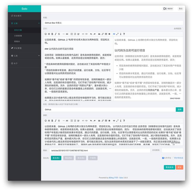 设计简洁,界面美观、Markdown 文章发布、自定义文章链接、支持多主题、支持插件扩展、支持 Emoji 表情、支持网易云音乐播放、支持附件和数据库备份、部署简单,不依赖 Tomcat、无需数据库,内嵌 Sqlite
