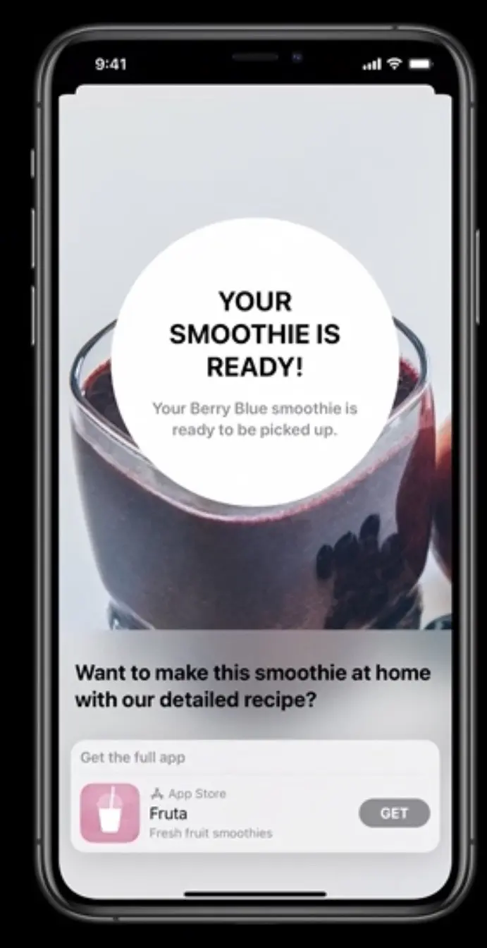 前面提过在产品理念上小程序和 Clip 很相似,甚至说不定 Clip 是受了小程序的启发。在市场上,小程序是 Clip 的真正对手。 小程序基于微信的 app,Clip 基于操作系统,因此在能力上 Clip 有优势。小程序的入口需要先打开微信,而 Clip 可以通过 NFC 靠近直接激活应用。对于开发者而言,Clip 可以直接获得很多原生的能力(比如 push),如果用户喜欢可以关联下载自己的原生应用。在小程序中,微信出于商业原因开发者不能直接跳转到自有 app,小程序的能力也依赖于微信提供的接口。 对于从 Clip 关联主 app 苹果还挺重视的,提供了几个入口展示关联 app。 首先在 clip 的展示页就会显示: