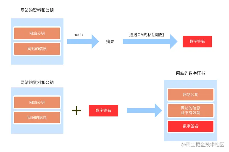 - CA对网站的资料和公钥使用hash函数得到摘要,再用CA的私钥将摘要加密生成